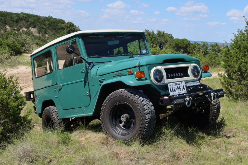 This 1973 Toyota Land Cruiser was acquired by its current owner out of New Mexico in 2012, and it subsequently received a cosmetic and mechanical refurbishment. Work included refinishing the exterior in green, refreshing the black interior, modification of the 3.9-liter F inline-six, and fitting a Toyota H55F five-speed manual transmission. Additional modifications include a rebuilt 2F cylinder head, a roll cage, fuel injection, a winch, dual batteries, a suspension lift, front disc brakes, LED exterior lighting, aftermarket wheels, Bestop seats, and a hardtop and full-frame doors.