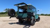 The suspension is modified with a Cool Cruisers of Texas 2.5″ lift kit, and aftermarket 15″ wheels are fitted with 31×10.5″ Cooper STT Maxx tires. A matching spare is mounted to the rear swing-away carrier. Braking is handled by discs up front and drums at the rear, and the truck is equipped with FJ60-sourced power steering.