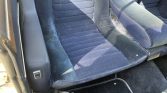 The cabin retains front buckets trimmed in blue cloth with matching rear seats and door panels. The interior is equipped with front vent windows, a locking glove compartment, and a Blaupunkt AM/FM/cassette player and equalizer playing through aftermarket speakers. Wear is noted throughout the interior, as is discoloration on the headliner, peeling wood veneer trim, and failing bright-finished trim.