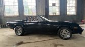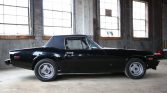 The car is finished in black with a vinyl-covered black removable hardtop underpinned by an Autopower roll bar. Other exterior features include driving lamps, dual side mirrors, black bumpers with chrome aLents, and a black soft top that is shown raised in the photo gallery below. Close-up images show tears and patches in the top as well as blemishes in the paint that include cracks, scratches, chips, and dings. A boot cover is included in the sale.