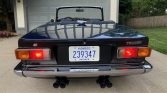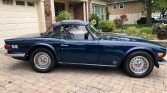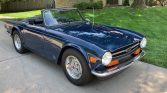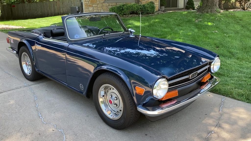 This 1974 Triumph TR6 is powered by a 2.5-liter inline-six mated to a four-speed manual transmission, and it is finished in dark blue over a black interior. Features include a black convertible top, chrome bumpers, dual SU carburetors, an S2-specification camshaft, a Monza exhaust system, and an AM/FM radio. The car reportedly spent time in Illinois, where it was refurbished during previous ownership, and it was acquired by the seller in 2017 and relocated to Kansas. Services performed during current ownership reportedly included an alignment, a valve adjustment, refurbishment to the transmission, and replacement of the clutch and rear brake components.