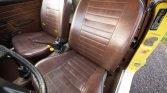 The cabin features seats trimmed in brown vinyl with matching door panels and carpeting. A refresh of the interior under current ownership included reupholstering the rear window shelf, and replacing the seat foam, dash pad, and sun visors. The keyed ignition switch is a replacement.