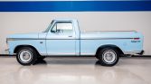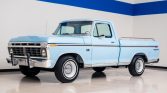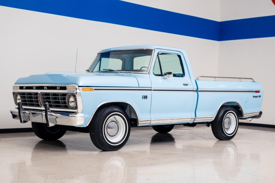 …This 1975 Ford F-100 Ranger XLT is a regular-cab pickup finished in light blue over a blue vinyl interior and powered by a carbureted 360ci V8 paired with a three-speed automatic transmission. Additional equipment includes air conditioning, an AM radio, bodyside moldings, bed rails, dual exhaust outlets, and 15″ steel wheels.