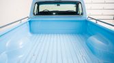 White-painted 15″ steel wheels with dog-dish hubcaps wear thin whitewall 225/75 Nexen N’Priz AH8 tires. The truck is equipped with power-assisted brakes.