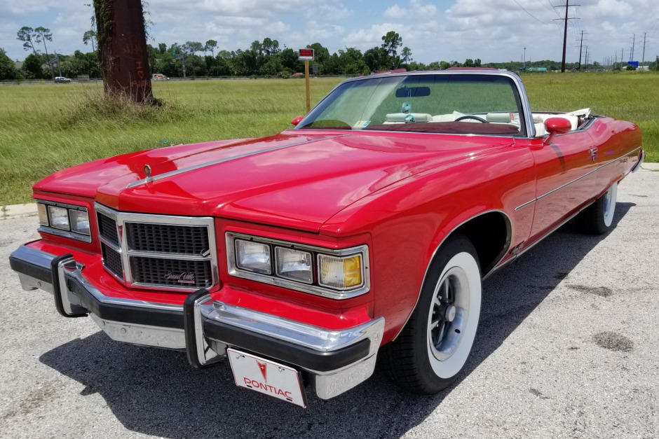 Pontiac built 4,519 Grand Ville convertibles for 1975, the final year the nameplate was offered. This car was delivered new in Roman Red, and the seller states that it was refinished at some point. Features include a powered white soft top, side trim moldings, chrome rocker-panel trim, chrome-finished bumpers with guards, and rear fender skirts.