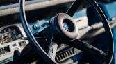 High-backed front bucket seats are trimmed in black vinyl, and inward-facing jump seats are mounted in the cargo area. Additional features include rubberized floor coverings and a period Boman Astrosonix push-button radio.
