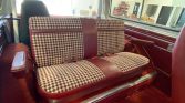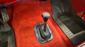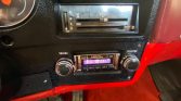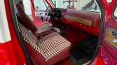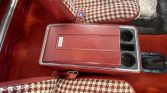 The cabin features seats upholstered in red and white houndstooth cloth with red vinyl trim, and the red carpeting is protected by black rubber floor mats. Wood veneer trim aLents the matching dashboard and door panels. Features include a center storage console with cup holders, crank windows, a replacement speaker, and a vintage-look stereo with an auxiliary input jack.