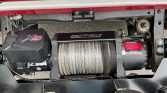 Originally finished in yellow, the truck was repainted red under previous ownership and features a removable hardtop with a white roof. Additional exterior equipment includes an ARB bumper with an integrated Smittybilt winch, yellow driving lights, LED headlamps, a swing-out spare tire carrier, and diamond-plated side steps and lower body trim. Replacement rear bumperettes were installed by the seller.