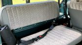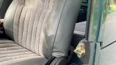 The cabin features later-style bucket seats and inward-facing rear benches upholstered in gray vinyl with patterned cloth inserts in addition to replacement carpets and matching door panels. Amenities include a lockable storage console with cupholders and a retro-style digital stereo feeding a combination of Polk and Boss speakers.