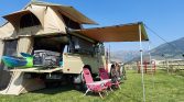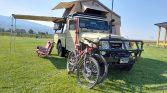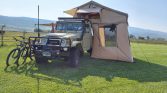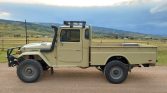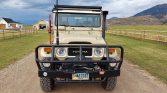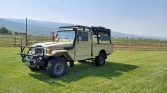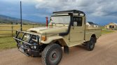 This 1982 Toyota Land Cruiser FJ45 is a left-hand drive pickup and is finished in beige with a white roof over a green plaid interior and powered by a replacement 4.2-liter inline-six paired with a four-speed manual transmission and a dual-range transfer case. Equipment includes a Front Runner roof rack with an LED light bar, an ARB bull bar with LED driving lights, a Warn winch, a high lift jack, Ironman 4×4 suspension, a snorkel, dual batteries,…