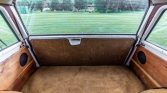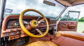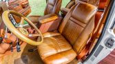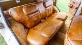 The cabin features replacement power-adjustable heated front seats upholstered in Almond brown and wood trim accents the steering wheel, dashboard, and door panels. Additional features include an Alpine head unit, an alarm system, and power windows, mirrors, and door locks. The air conditioning condenser is disabled and various hoses for the system are missing. A replacement rear passenger door locking mechanism was installed in preparation for the sale.