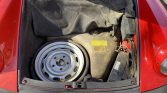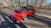 The car is finished in red and features a black convertible top, black side moldings, a boot cover, rear bumperettes, and integrated fog lights. Rust is shown at the front base of the front right fender, chips and scrapes can be seen on the front bumper, and other blemishes are depicted in the photos presented in the gallery below. A tear on the left side of the convertible top is also shown in the gallery.
