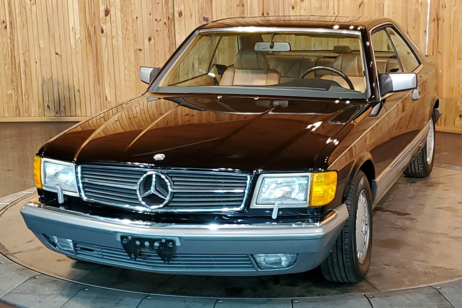This 1986 Mercedes-Benz 560SEC is finished in black with gray lower cladding, and it is powered by a 5.5-liter V8 paired with a four-speed automatic transmission. Equipment includes headlight wipers, an electric sunroof, 15″ alloy wheels, automatic climate control, cruise control, Palomino leather upholstery, heated and power-adjustable front seats, and a Becker Grand Prix cassette stereo. The car was first owned in Florida, and it spent time in Arizona, Wisconsin, Illinois, and New York prior to its acquisition by the seller in April 2019.