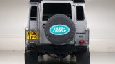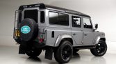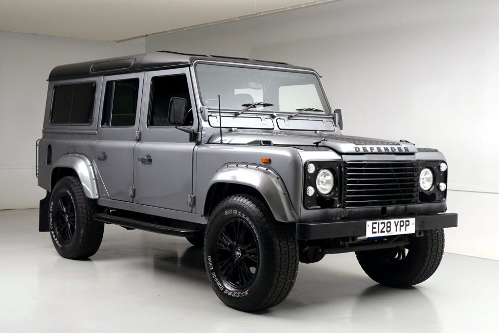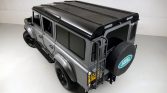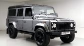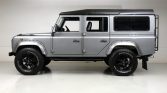 This 1987 Land Rover 110 was imported from the United Kingdom in late 2015 and has since been refinished in silver over a refreshed diamond-stitched gray interior. Power comes from a fuel-injected 3.5-liter V8 paired with a five-speed manual transmission and a dual-range transfer case, and features include a black roof, a rear ladder, a rear-mounted spare tire, fender flares, aftermarket 18″ wheels, seating for nine oLupants with four rear jump seats, an armrest console, and a Kenwood stereo.