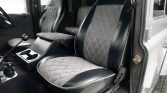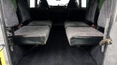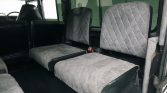 The interior has been redone in diamond-stitched gray cloth on the front bucket seats, three-way-split rear seat, and four jump seats in the cargo area. The front bucket seats feature black bolsters and headrests, and the armrest console with cupholders has been re-covered to match. The headliner has also been replaced, and a double-DIN Kenwood stereo has been mounted in the dashboard.