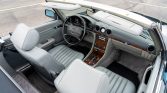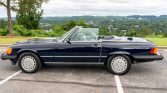 This 1987 Mercedes-Benz 560SL is finished in Midnight Blue over gray leather and is powered by a 5.5-liter V8 paired with a four-speed automatic transmission. Equipment includes a body-color removable hardtop, a blue soft top, painted 15″ Gullideckel alloy wheels, fog lights, automatic climate control, cruise control, a Becker Grand Prix AM/FM/cassette stereo, and an alarm system.