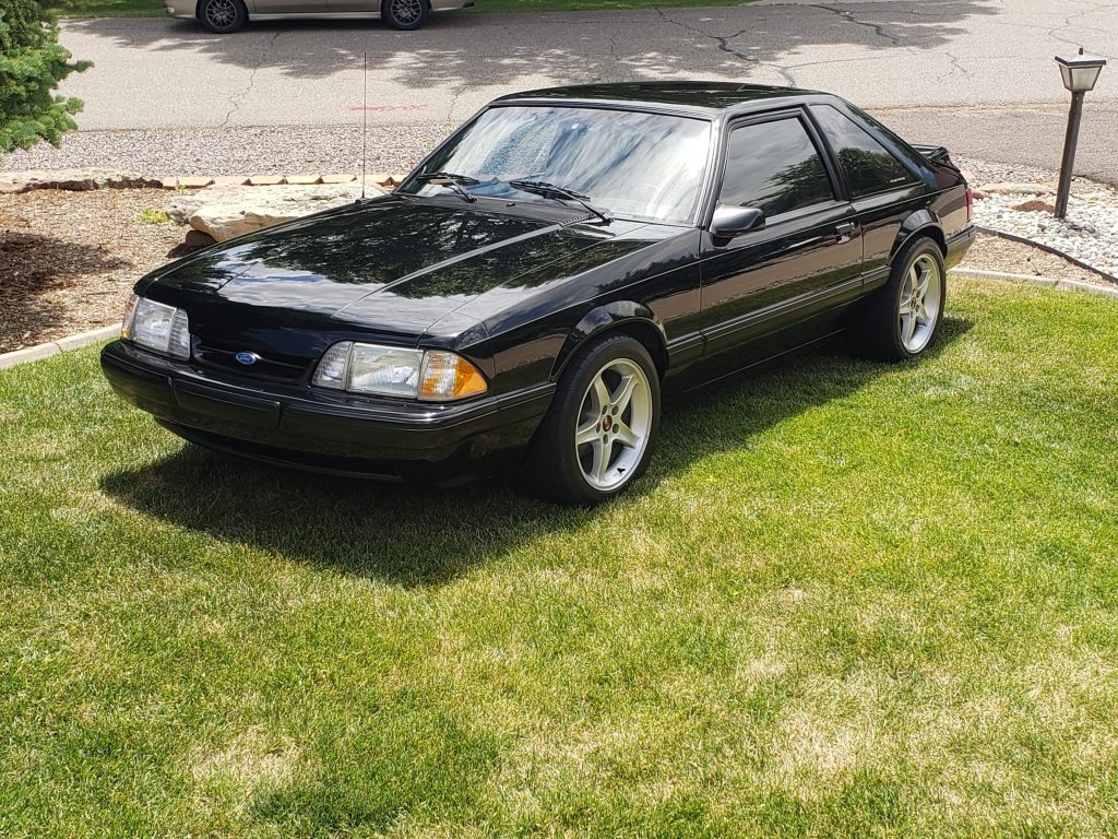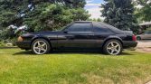 This 1989 Ford Mustang LX 5.0 is finished in black over gray cloth and is powered by a supercharged 5.0-liter V8 paired with a five-speed manual transmission and a limited-slip differential. Equipment includes 17″ Cobra R alloy wheels, a hatch spoiler, air conditioning, cruise control, and a cassette stereo. Modifications include a Vortech S-trim supercharger, GT40 cylinder heads, a Ford Performance B303 camshaft, a Ford Racing SVT Cobra intake manifold, JBA shorty-style exhaust headers, a Bassani exhaust system, Tokico shocks and struts, Eibach progressive springs, Eibach front and rear sway bars, an aluminum driveshaft, SVO-spec four-wheel disc brakes, a Cobra-spec brake booster, and a Modern Driveline Kevlar clutch, billet flywheel, and pressure plate.