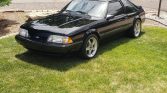 This 1989 Ford Mustang LX 5.0 is finished in black over gray cloth and is powered by a supercharged 5.0-liter V8 paired with a five-speed manual transmission and a limited-slip differential. Equipment includes 17″ Cobra R alloy wheels, a hatch spoiler, air conditioning, cruise control, and a cassette stereo. Modifications include a Vortech S-trim supercharger, GT40 cylinder heads, a Ford Performance B303 camshaft, a Ford Racing SVT Cobra intake manifold, JBA shorty-style exhaust headers, a Bassani exhaust…