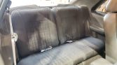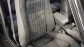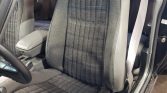 The cabin features gray cloth upholstery with patterned inserts and a matching dashboard, center console, door panels, and carpets. Equipment includes air conditioning, cruise control, a Hurst shifter, and a cassette stereo.