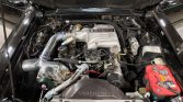 The 5.0-liter V8 was fitted with a Vortech S-trim supercharger under previous ownership. Additional modifications include GT40 cylinder heads, a Ford Performance B303 camshaft, a Ford Racing Cobra-spec intake manifold, an MSD distributor and ignition controller, Performance Distributor spark plug wires, March underdrive pulleys, a Pro-M Racing mass air meter, a BBK throttle body, aftermarket fuel injectors, an aluminum radiator with blue silicone hoses, JBA shorty-style exhaust headers, and an SVE 130-amp alternator.