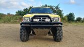 Polished 15″ aluminum wheels wear 33×12.50″ Ironman All Country M/T tires. A matching spare wheel with a BFGoodrich tire is mounted below the cargo area, and the front axle is equipped with manually-locking hubs. The truck features a Pro Comp 4″ suspension lift with a 1/2″ body lift and replacement rear leaf springs, according to the seller. A replacement idler arm and bracket, pitman arm, MOOG upper and lower ball joints, and inner and outer tie rods are included in the sale.