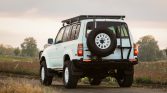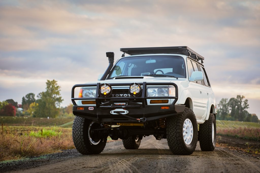 The truck is finished in white and equipped with a sunroof, an ARB front bumper with a T-MAX winch, Baja Designs LC9 lights, a 4×4 Labs rear bumper with Baja Designs LED reverse lights, fuel jug mount, and an Ironman 4X4 snorkel.