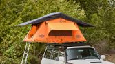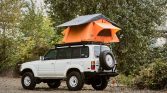 A rear ladder leads to a Front Runner full roof rack with a Tepui roof tent on quick release connections. A Hi-Lift jack, a tow strap, and a winch controller are also included in the sale.