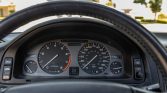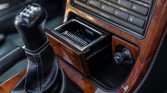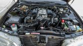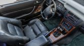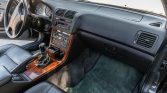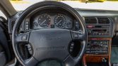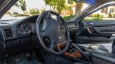 The cabin features heated and power-adjustable front seats upholstered in black leather with matching carpets as well as wood veneer aLents on the matching dashboard, center console, and door panels. Amenities include automatic climate control, cruise control, power aLessories, and a Bose AM/FM/cassette stereo with a trunk-mounted CD changer. Wear is visible on the outer bolster of the driver’s seat.