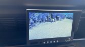 The cabin features front and rear Exmoor seating trimmed in black vinyl with matching floor and door panels. A custom newer-style dash houses aftermarket toggle switches and a screen for the backup camera system. Equipment includes heated front seats, air conditioning, a rear defroster, a Bluetooth-capable Kenwood stereo, Bose speakers, a Cobra CB radio, auxiliary power outlets, an analog clock, and an underfloor rear storage drawer.