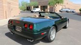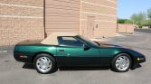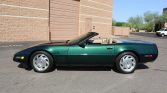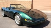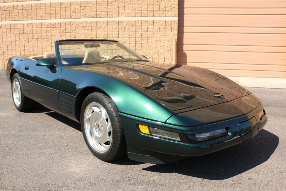 This 1994 Chevrolet Corvette Convertible is finished in Polo Green Metallic over beige leather and is powered by a 5.7-liter LT1 V8 paired to a six-speed manual transmission. Equipment includes a beige convertible top, FX3 Electronic Selective Ride and Handling suspension, electronic climate control, 17″ alloy wheels, power-adjustable sport seats, and a Delco-Bose stereo, and the car is also fitted with a Corsa Performance exhaust system.  First delivered to Jack Matia Chevrolet of Elyria, Ohio, the car…