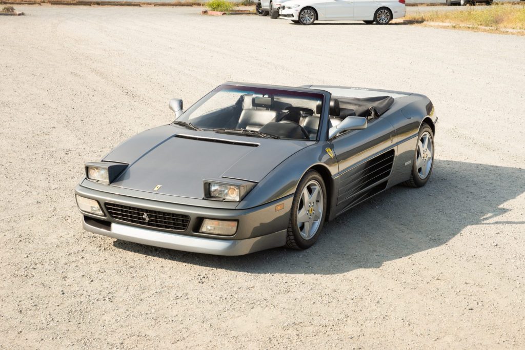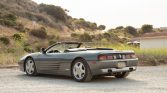 This 1994 Ferrari 348 Spider is finished in metallic gray over black Connolly leather, and it is powered by a 3.4-liter V8 paired with a five-speed manual transaxle and a limited-slip differential. Equipment includes a black convertible top and boot cover, pop-up headlights, 17″ alloy wheels, air conditioning, a gated shifter, drilled metal pedals, a Pioneer stereo, and a leather-wrapped steering wheel.