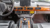 The cabin is said to have been reupholstered in black leather under previous ownership and features burl wood trim on the dashboard, center console, gear selectors, and door panels. Additional amenities include air conditioning, cruise control, an analog clock, and power-adjustable heated front seats with driver position memory. An aftermarket touchscreen head unit is mounted to the dashboard, and the removed factory stereo is included in the sale.