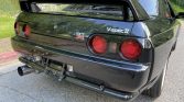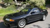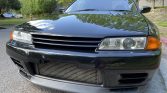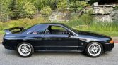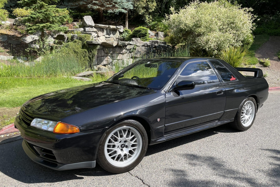 The GT-R version of the R32 features widened front and rear fenders as well as a front lip, side skirts, and rear wing from the factory. This example is one of 104 V-Spec II models finished in Black Pearl Metallic (732), and decals have been applied to the rear quarter windows.