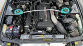 The twin-turbocharged 2.6L RB26DETT inline-six is said to have been fitted with HKS components including turbochargers, intercooler, piping, downpipe, and exhaust. An aluminum radiator and a teal-accented strut bar also have been installed. In early 2021 the oil was changed and the spark plugs were replaced.