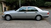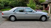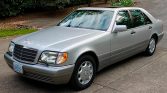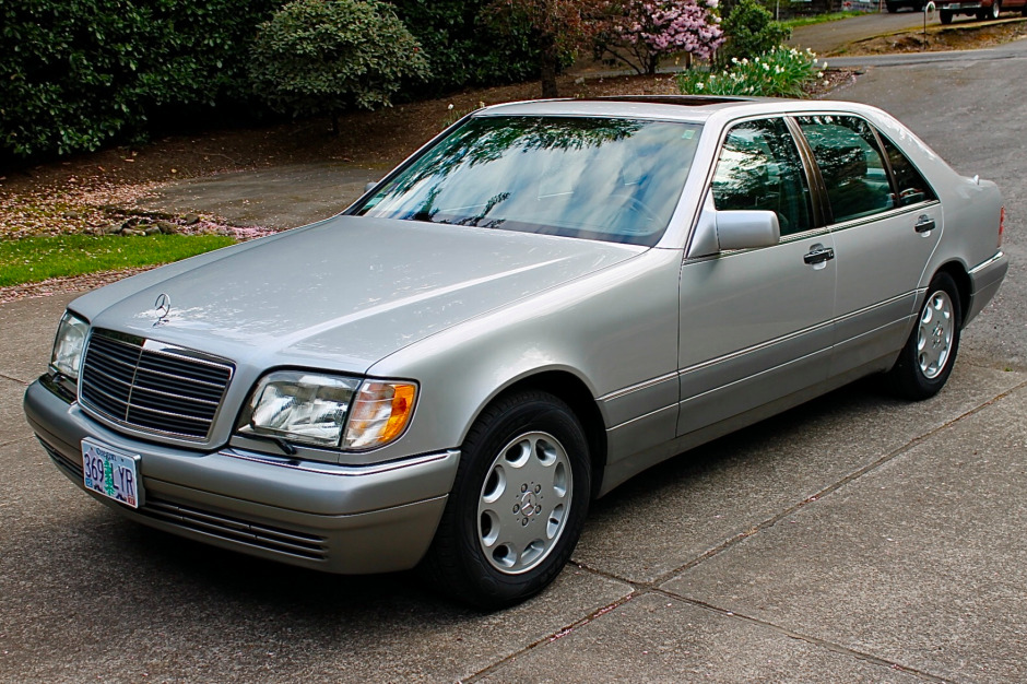 This 1995 Mercedes-Benz S420 is finished in Brilliant Silver Metallic over gray leather and is powered by a 4.2-liter V8 paired with a five-speed automatic transmission. Features include a power-operated sunroof, wood interior trim, dual-zone automatic climate control, heated and power-adjustable front seats, and a factory cassette stereo with added Bluetooth connectivity.