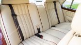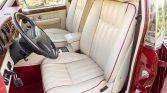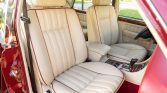 The interior features seating surfaces upholstered in Parchment leather with St. James Red piping along with a burgundy dashboard, wool carpets, and burl wood veneers on the dash, center console, and door panels. The heated and power-adjustable front seats feature position memory, and other amenities include automatic climate control, power accessories, cruise control, organ-stop vent controls, and a six-disc CD changer housed in the center console.