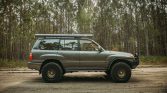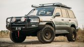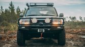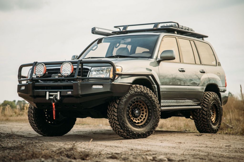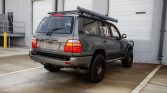 This 1998 Toyota Land Cruiser is finished in River Rock Green Mica over a beige interior, and it is powered by a 4.7-liter V8 paired with a four-speed automatic transmission, a dual-range transfer case, and a locking rear differential. The truck was first registered in Florida and was acquired by the seller in late 2020. Subsequent modifications have included installing 17″ Fuel wheels, a Dobinsons lift kit, a Trail Tailor front differential drop kit, a Smittybuilt winch, ARB LED auxiliary lights, ARB slider steps and fender protection bars, a Pioneer touchscreen head unit with Apple CarPlay, aftermarket speakers and subwoofer, an ARB retractable awning, and a Dobinsons front bumper and roof rack. In preparation for the sale, the engine oil was changed and fluids were flushed and replaced in the transfer case, front and rear differentials, and brake system.
