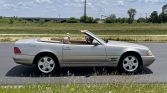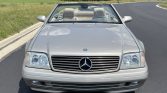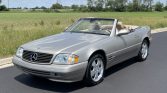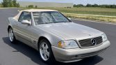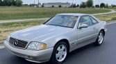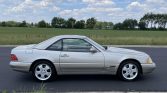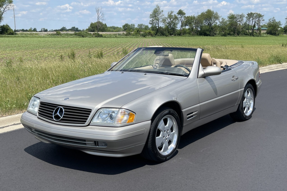 This 1999 Mercedes-Benz SL500 was first registered in California and spent time in Colorado and Arizona before being acquired by the selling dealer in May 2021. The car is powered by a 5.0-liter V8 paired with a five-speed automatic transmission, and it is finished in Smoke Silver Metallic over Saffron leather. Equipment includes a Java soft top, a removable hardtop, heated and power-adjustable seats, automatic climate control, cruise control, and power windows, locks, and mirrors.