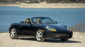This 1999 Porsche Boxster is finished in black over beige leather and is powered by a 2.5-liter flat-six paired with a five-speed manual transaxle. Equipment includes a power-operated black soft top, a Blaupunkt CD stereo, cruise control, automatic climate control, and 17″ alloy wheels. Maintenance since 2019 included replacement of cooling system and front suspension components, and an oil change service was completed in preparation for sale.