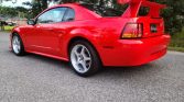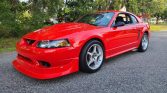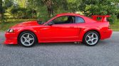 Factory 18″ aluminum wheels are mounted with 265/40 Bridgestone Expedia S-01 tires. Braking is handled by four-wheel ventilated discs paired with Brembo four-piston front calipers. The Cobra R package specified an independent rear suspension system along with stiffer Eibach springs, larger anti-roll bars, and Bilstein Monotube dampers.