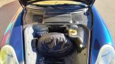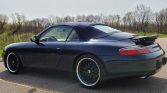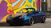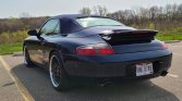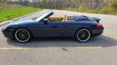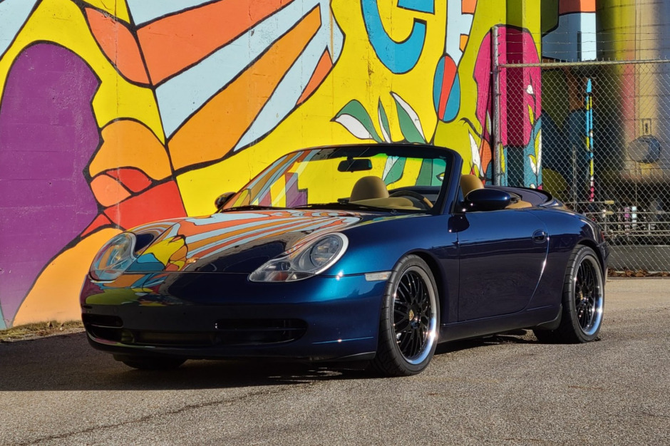 This 2000 Porsche 911 Carrera cabriolet is finished in Ocean Blue Metallic over Savannah Beige leather and powered by a 3.4-liter flat-six paired with a six-speed manual transaxle. Equipment includes a power-operated blue soft top, Porsche Stability Management, a modified exhaust system, clear corner lenses, 18″ aftermarket wheels, H&R Sport lowering springs, power-adjustable front seats, and a factory stereo with Bluetooth compatibility.