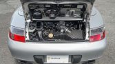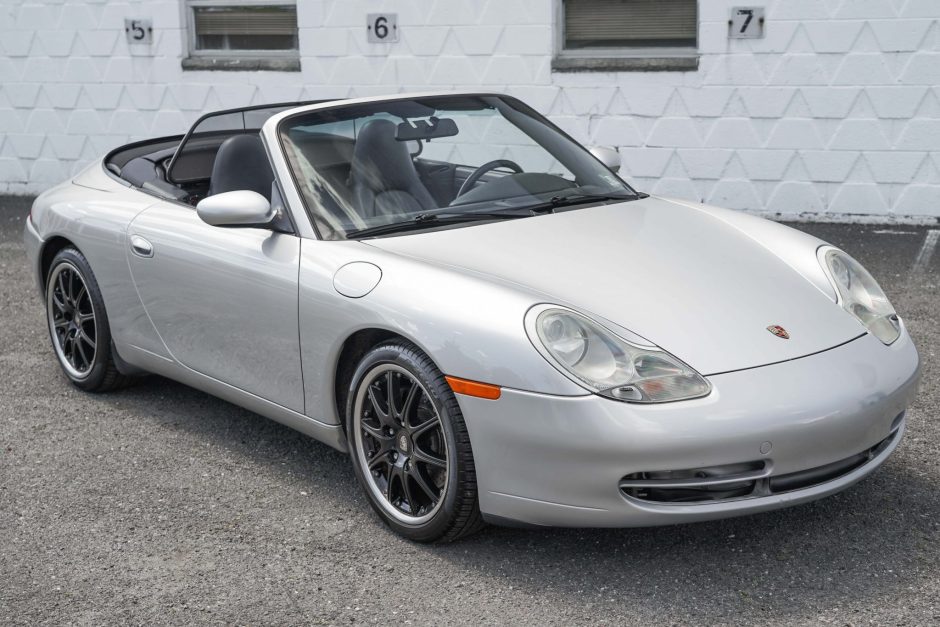 This 2001 Porsche 911 Carrera 4 cabriolet is finished in silver over Metropol Blue draped leather, and it is powered by a 3.4-liter flat-six paired with a six-speed manual transaxle and all-wheel drive. Equipment includes a black convertible top, a wind deflector, black-finished 18″ Sport Design wheels, the Design Package, the Comfort Package, and the Technic Package, the latter of which added self-washing xenon headlights, an onboard computer, and a six-disc CD changer.