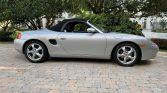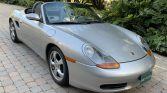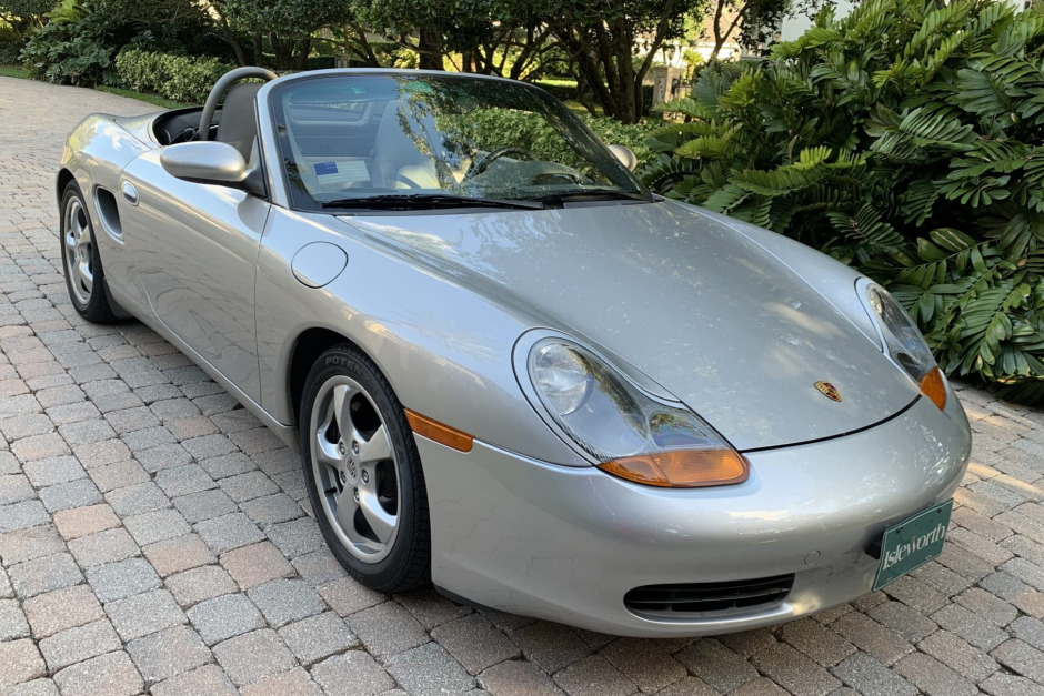 This 2001 Porsche Boxster was purchased new by the seller from Jim Ellis Automotive Group of Atlanta, Georgia, and relocated to Florida in 2002. The car is finished in silver with a black convertible top, and it is powered by a 2.7-liter flat-six paired with a five-speed manual transaxle. Equipment includes a speed-activated rear spoiler, 17″ alloy wheels, Graphite Grey partial-leather upholstery, automatic climate control, cruise control, and a Porsche CDR-220 stereo. Recent service consisted of an oil change and replacement of the steering-lock housing and battery.