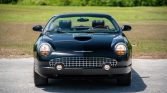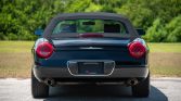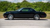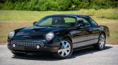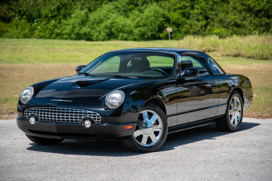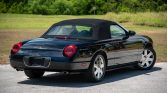 This 2002 Ford Thunderbird is finished in black over black and red leather and is powered by a 3.9-liter V8 paired with a five-speed automatic transmission. Equipment includes a power-retractable black soft top, a body-color removable hardtop, dual-zone automatic climate control, cruise control, traction control, a CD stereo, power-adjustable seats, fog lights, and chrome-finished 17″ wheels.