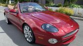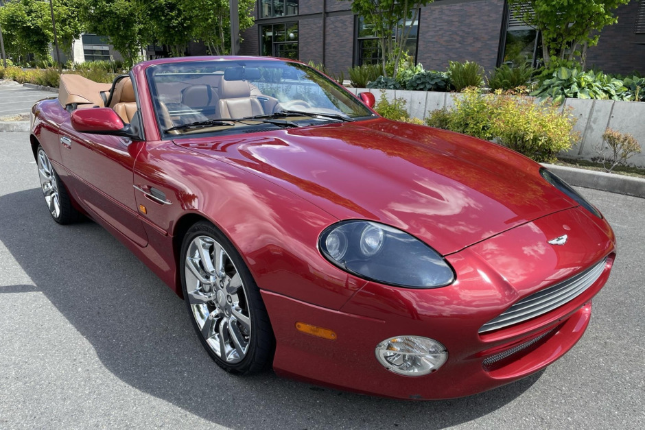 This 2003 Aston Martin DB7 V12 Vantage Volante is powered by a 5.9-liter quad-cam V12 paired with a five-speed Touchtronic automatic transmission and is finished in Toro Red over a Light Tan leather interior. Equipment includes uprated brakes, a heated windshield, power-folding mirrors, a premium audio system, and a golf umbrella. Service since 2020 has included replacement of the left-side catalytic converter, ignition coils, spark plugs, EGR valves, crank position sensors, front struts, and intake manifold gaskets.