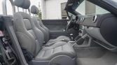 The seating surfaces are upholstered in grey leather, and aluminum trim accents the dashboard and door panels. Amenities include heated seats, automatic climate control, a factory CD stereo, a rear windscreen, roll hoops, a black leather deck cover, and aluminum pedal covers.