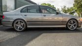 Chrome-finished 19″ aftermarket wheels are mounted with 245/35 and 275/30 Michelin Pilot Sport 2 tires showing 2005 date codes, and the seller notes peeling chrome on the wheels. The M5 features more aggressive shock valving as well as thicker front and rear anti-roll bars when compared with the contemporary E39 5-Series.