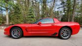 This 2003 Chevrolet Corvette Z06 is finished in Torch Red over black leather and is powered by a 5.7-liter LS6 V8 paired with a six-speed manual transaxle and a limited-slip differential. Equipment includes staggered-diameter wheels, brake cooling ducts, power aLessories, a head-up display, dual-zone automatic climate control, and Bose audio. The alternator and the serpentine belt were reportedly replaced in 2019.