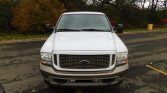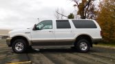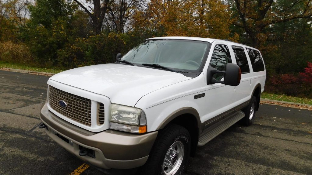 This 2003 Ford Excursion Eddie Bauer 4×4 is finished in Oxford White over Parchment leather and is powered by a 6.0-liter Power Stroke turbodiesel V8 mated to a five-speed automatic transmission, a two-speed transfer case, and a limited-slip rear differential. Equipment includes heated and power-adjustable front seats, automatic climate control, three rows of seating, 16″ chrome wheels, heated and telescopic side mirrors, rear parking sensors, and an Air Lift load support system.