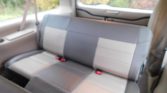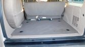 The cabin offers seating for eight passengers across three rows trimmed in brown leather with Medium Parchment inserts. Equipment includes wood-look interior trim, heated and power-adjustable front seats, automatic climate control, power windows, and a factory cassette stereo. The barn door tailgate features a separate glass lift gate.